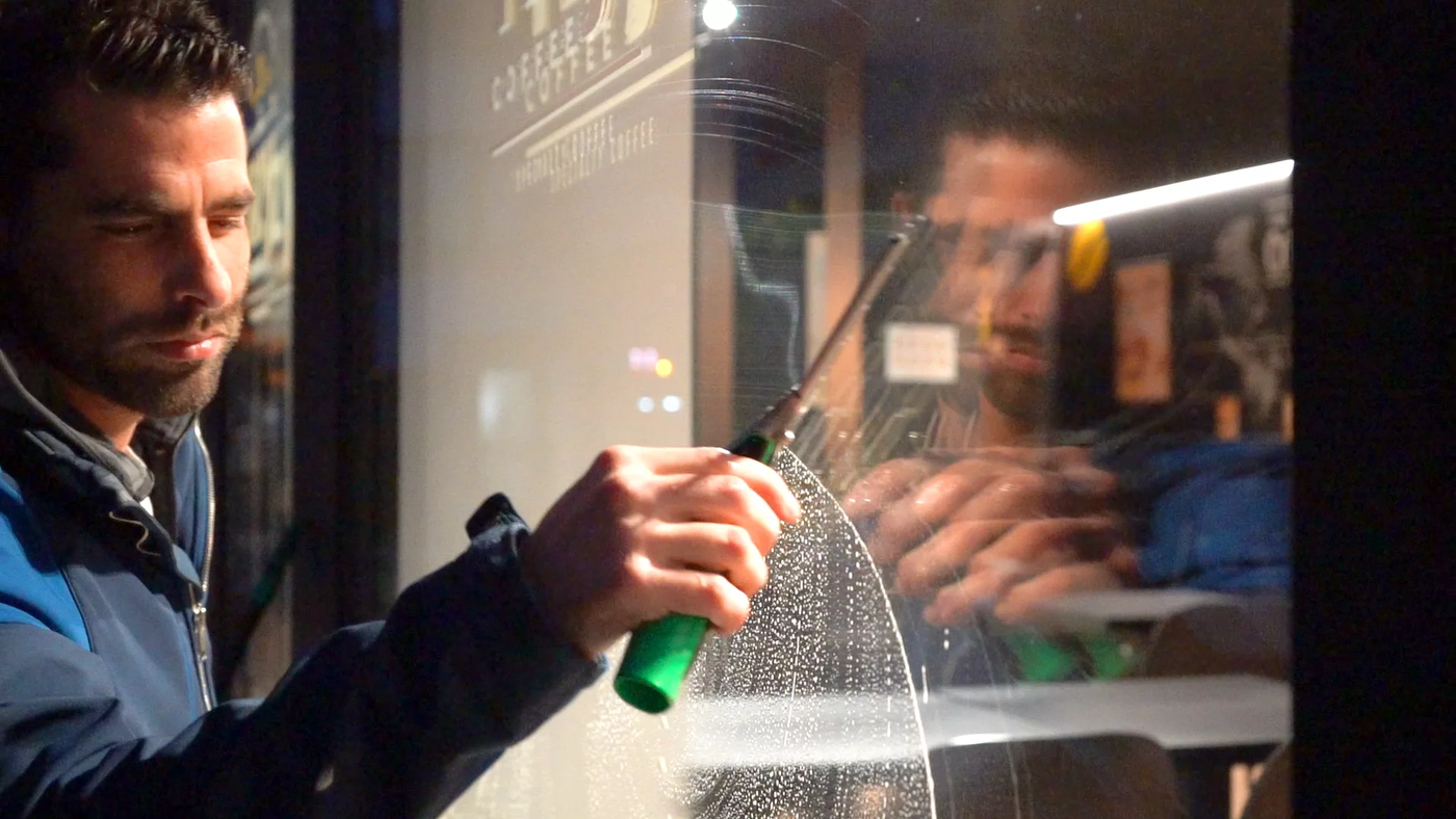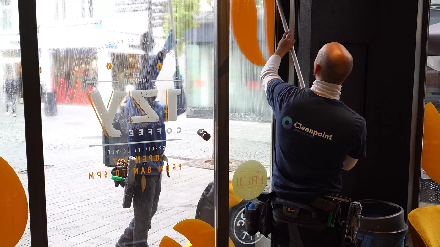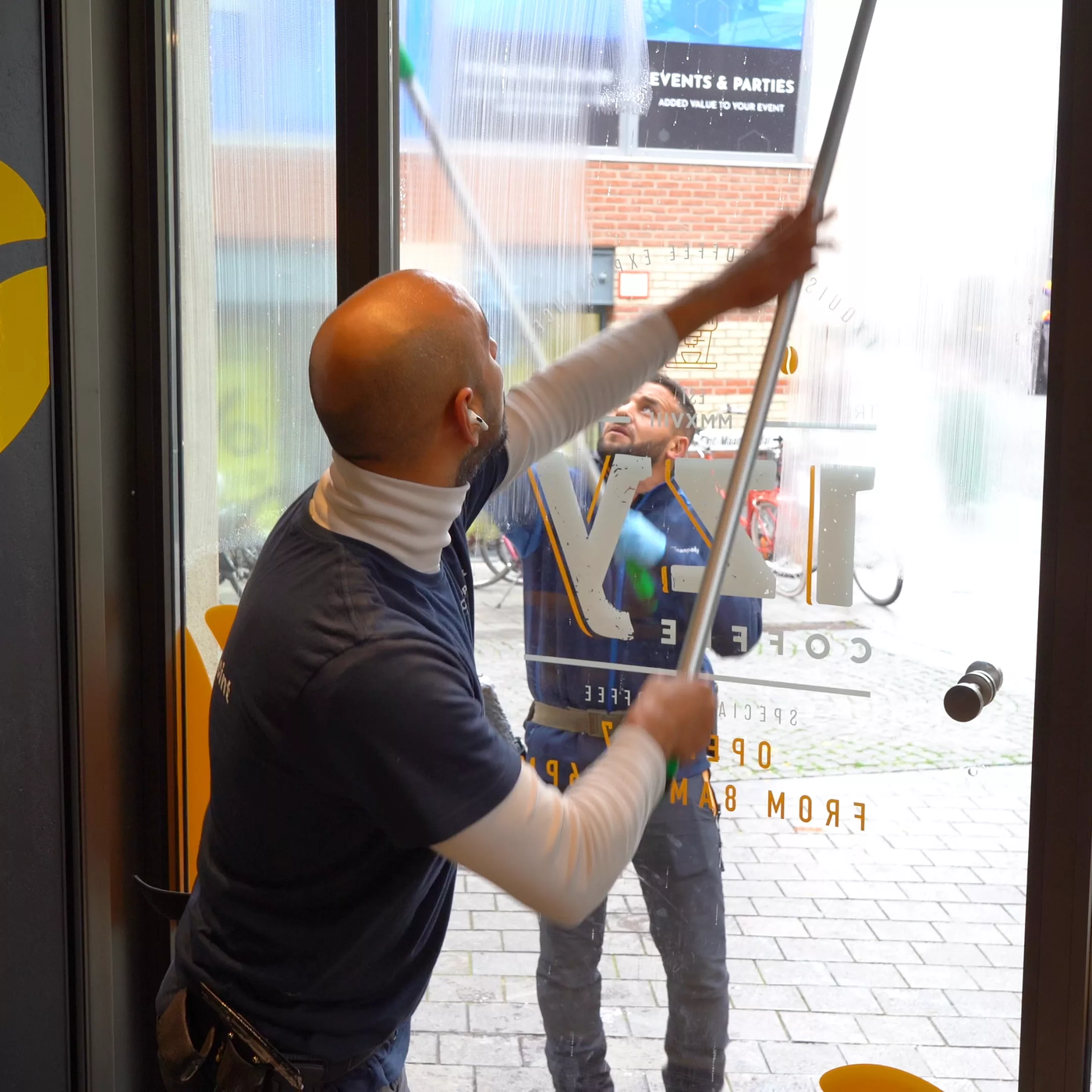 Dankzij een vaste planning en oog voor detail blijven de ramen streeploos schoon, zonder de werking van de zaak te verstoren.